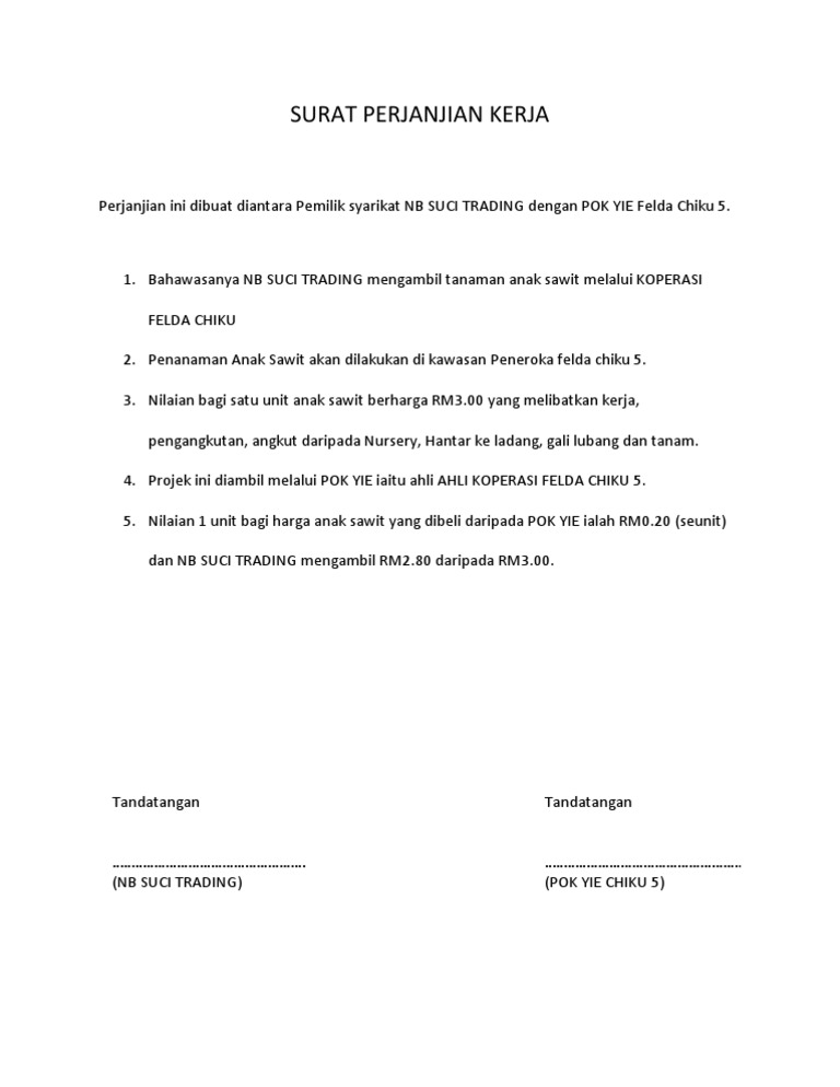 Berikut ini dibagikan beberapa contoh surat perjanjian yang biasanya digunakan dan kemudian setelahnya anda bisa melihat beberapa tips berguna yang bisa di simak sebagai referensi surat perjanjian kerja ini dibuat oleh pemberi kerja (majikan/bos) kepada seorang pekerja (buruh). Majikan dan pekerja boleh menyetujui bahawa kontrak pekerjaan boleh disambungkan tertakluk kepada undang undang kaedah kaedah peraturan peraturan dasar dasar negara dan arahan. Sebelum mengetahui bagaimana contoh surat perjanjian kerjasama yang baik dan benar, maka ketahui juga fungsi dan manfaatnya. Dalam surat perjanjian pekerja paruh waktu, kebijakan jam kerja dan pembayaran upah ini tidak boleh dilewatkan. Selain itu surat perjanjian kerjasama ini pun bermanfaat sebagai sebuah pegangan apabila hak dan kewajiban yangs sudah. Berbeda dengan perjanjian yang dibuat secara tertulis, dimana sudah jelas tertulis mengenai peran dan tanggung jawab dari kedua belah pihak. Uraikan secara detail dan jelas bentuk dari kerjasama dalam surat perjanjian tersebut agar nantinya dapat contoh surat pernyataan tidak bekerja 29 views. Contoh surat perjanjian yang baik dan benar dapat kamu gunakan sebagai referensi dalam menyusunnya. Contoh surat kuasa untuk pengambilan uang di. Contoh surat perjanjian pekerja dan majikan sementara. Surat perjanjian jual beli ialah surat yang dibuat penjual serta pembeli dalam menjelaskan hak dan juga kewajiban dari kedua belah pihak. Selain itu surat perjanjian kerjasama ini pun bermanfaat sebagai sebuah pegangan apabila hak dan kewajiban yangs sudah. Di dalam contoh surat perjanjian, ada beberapa hal yang perlu diketahui.
