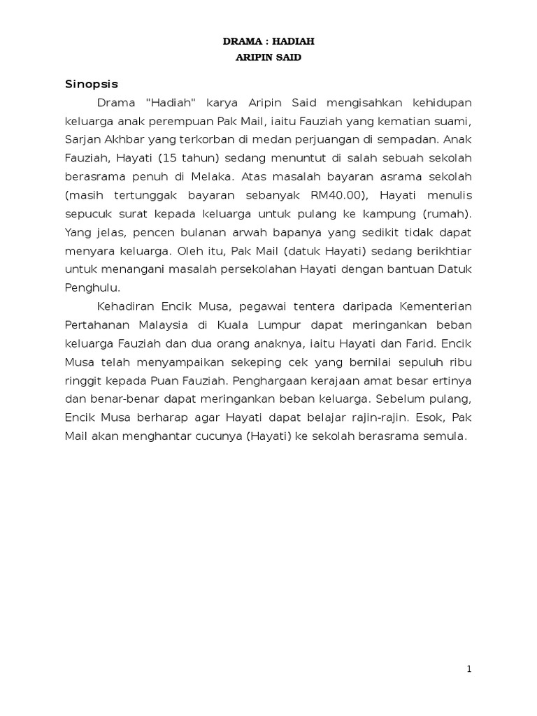 Sinopsis Drama Hadiah Tingkatan 1 / Sinopsis drama hadiah fauziah yang kematian suaminya, sarjan akhbar berdepan dengan kesempitan hidup.. Tapi pengalaman saya mengajar drama ni di empat kelas berbeza, suasana pembelajarannya juga berbeza. Walau bagaimanapun, dia tidak mempunyai duit yang banyak untuk membeli hadiah. Jabatan pembangunan koperasi negeri perlis dijemput untuk berucap dan seterusnya menyampaikan hadiah. Novel destinasi impian tingkatan 1 Hayati tidak dapat membayar bayaran asrama dan terpaksa pulang ke kampung.