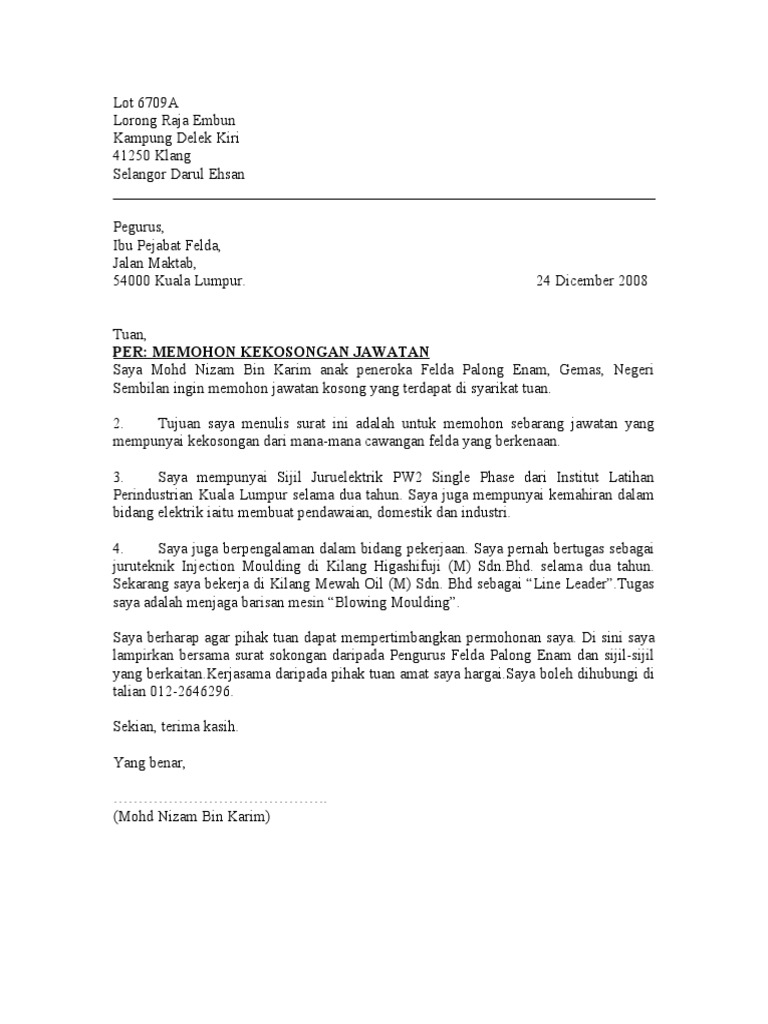 Contoh Surat Permohonan Kerja from imgv2-1-f.scribdassets.com Kerjasama yang menguntungkan antar kedua belah pihak memang seringkali dilakoni oleh para. Contoh surat permohonan kerja kosong dalam bahasa melayu. Surat permohonan merupakan surat yang berisi mengenai permohonan atau permintaan tentang sesuatu hal kepada pihak terkait, baik perseorangan, badan, organisasi, perusahaan ataupun instansi. Ada kalanya permohonan kerja memerlukan anda untuk menghantar surat sokongan kerja atau reference letter. Contoh surat rayuan permohonan kemasukan ke sekolah menengah teknik. Contoh surat permohonan kerjasama sponsor. Santri siap guna daarut tauhiid bandung gegerkalong girang no. Ada banyak surat permohonan yang beredar di dunia ini.
